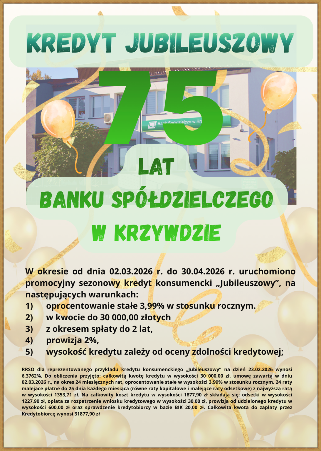 W okresie od dnia 02.03.2026 r. do 30.04.2026 r. uruchomiono promocyjny sezonowy kredyt konsumencki „Jubileuszowy”, na następujących warunkach: